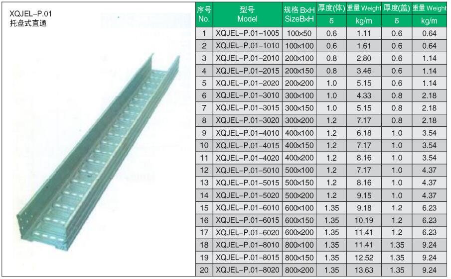 XQJEL_P.01托盤(pán)式直通產(chǎn)品型號(hào)、規(guī)格、重量等參數(shù)及XQJEL_P托盤(pán)式電纜橋架在不同跨距下允許均布載荷變形量。