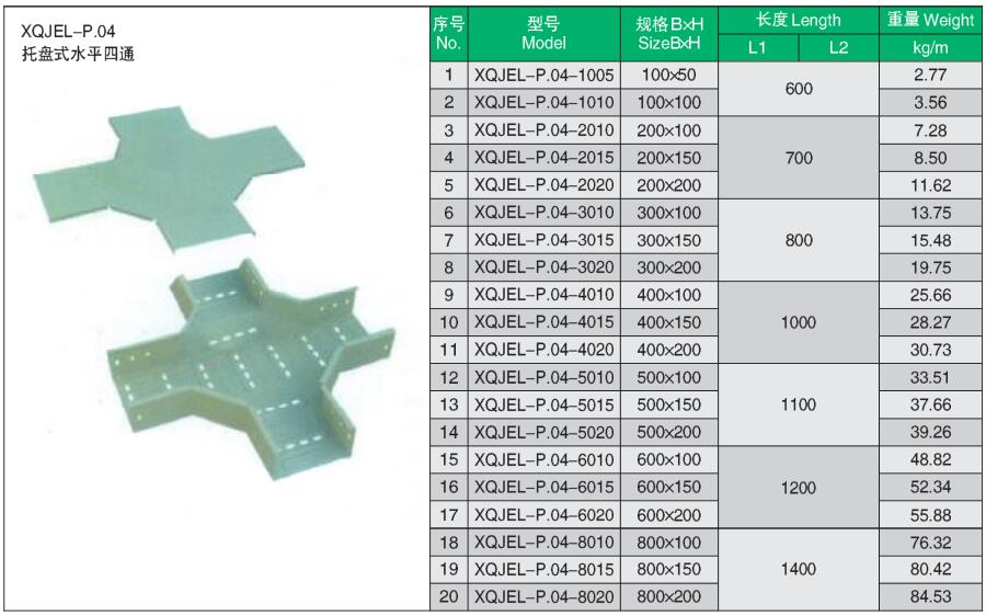 XQJEL_P.04托盤式四通產(chǎn)品型號(hào)、規(guī)格、重量等參數(shù)及XQJEL_P托盤式電纜橋架在不同跨距下允許均布載荷變形量。