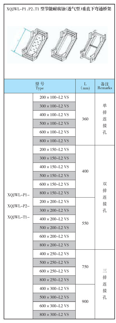 XQJWL-P1、P2、T1型節(jié)能耐腐蝕(透氣型)垂直下彎通橋架型號(hào)參數(shù):